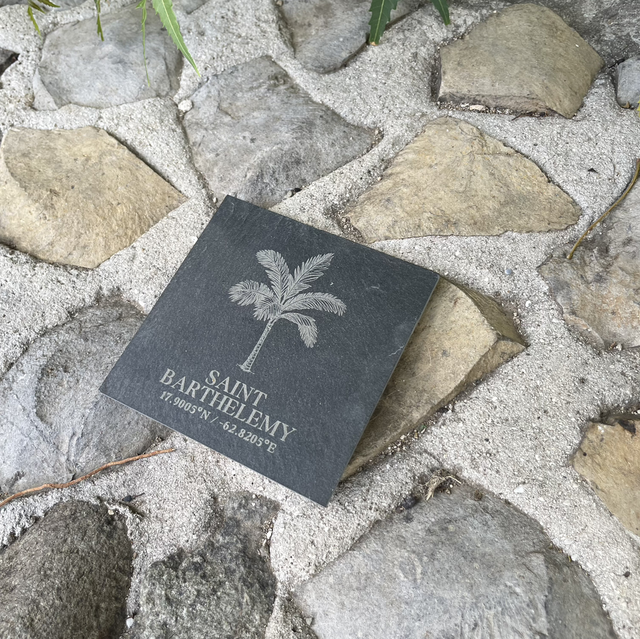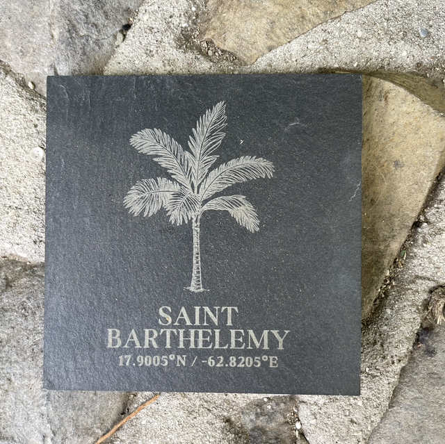 Élégant et naturel, ce dessous de verre en ardoise est gravé avec le nom de Saint-Barthélemy, pour une touche authentique à chaque pause café, apéritif ou moment de détente.
